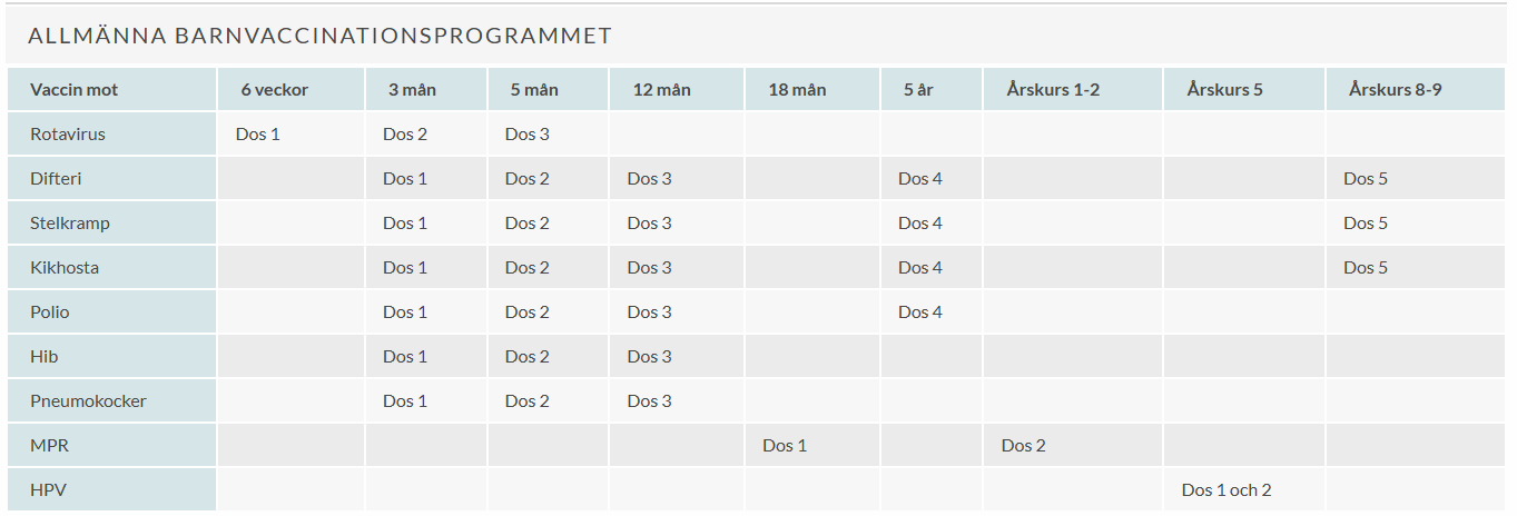 Vaccinationerna följer det svenska barnvaccinationsprogrammet och ges vid specifika åldrar, från 6 veckor upp till 9 års ålder. Se det detaljerade schemat ovan.